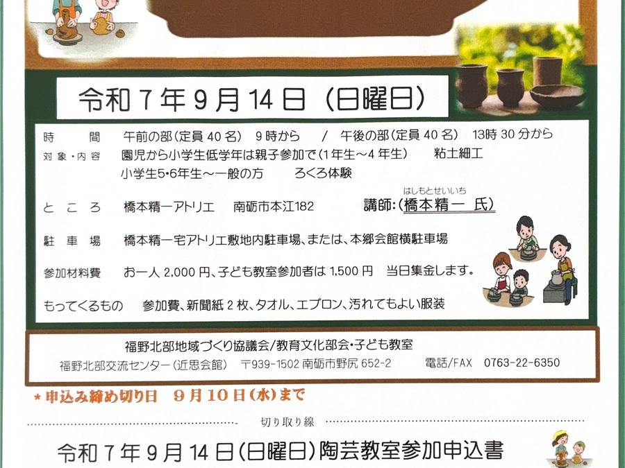 9月14日(日)陶芸教室 (家族で土の温もりを感じよう) 対象・内容:園児から小学生(1年生~4年生)低学年は保護者付添で 粘土細工