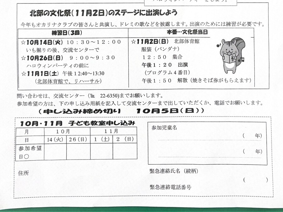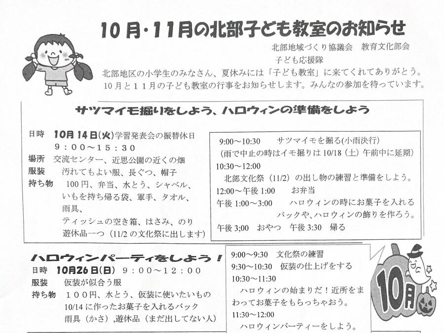10月14日(火)学習発表会の振替休日<サツマイモ掘りをしよう、ハロウィンの準備をしよう> 9:00~15:30 10月26日(日)ハロウィンパーティをしよう!9:00~12:00 11月2日(日)12:50 北部体育館に集合、13:20出演、13:50解散 申込締切日 10月5日(日)