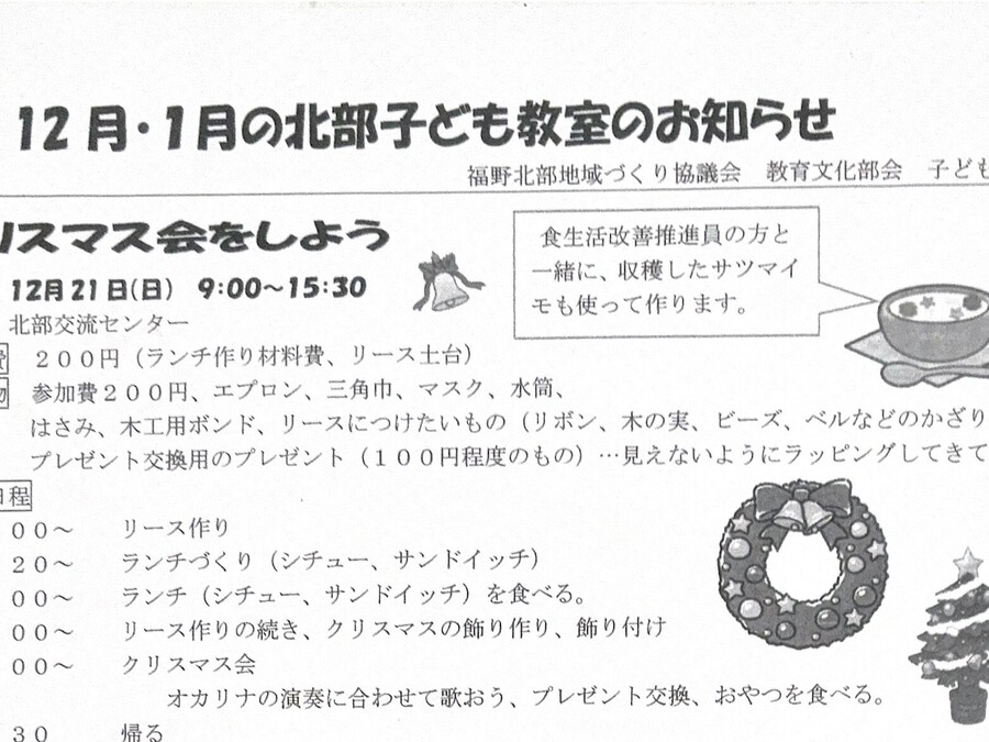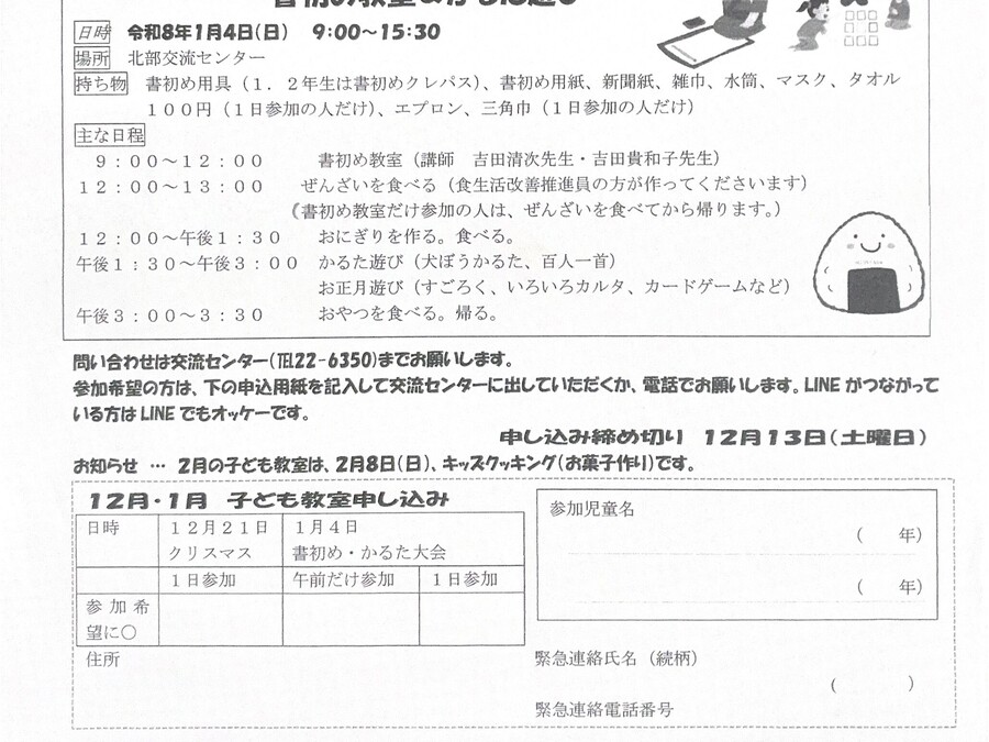 12月・1月の北部子ども教室のお知らせ (12/21日 クリスマス会)(1/4 書初め教室・かるた遊び)