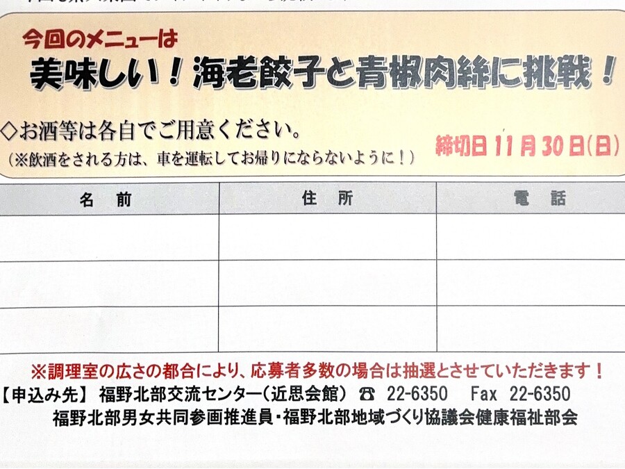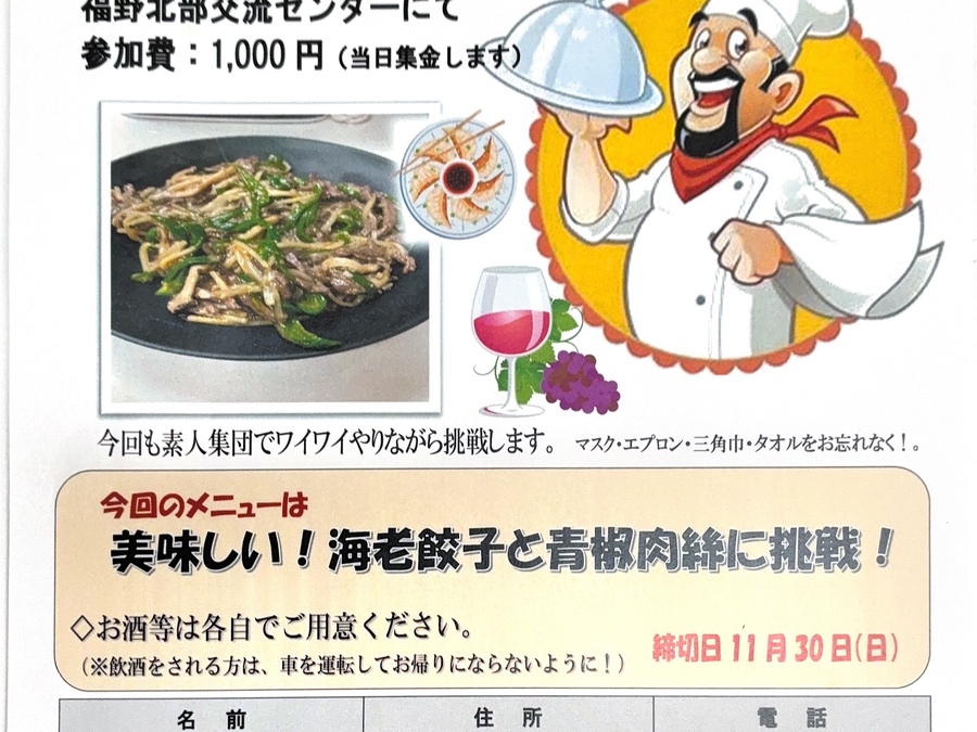 12月14日(日)男の料理教室 10:00から メニューは美味しい!海老餃子と青椒肉絲に挑戦!締切日11月30日 福野北部地域づくり協議会