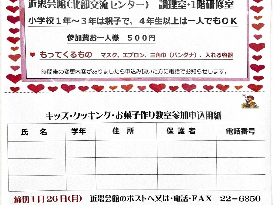 キッズクッキングお菓子作り 2月8日(日)9:00時受付、9:30~( 小学校1年~3年は親子で、4年生以上は一人でもOK)