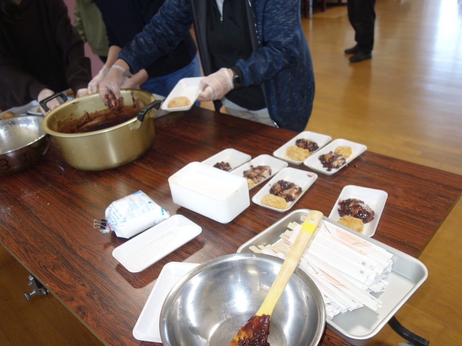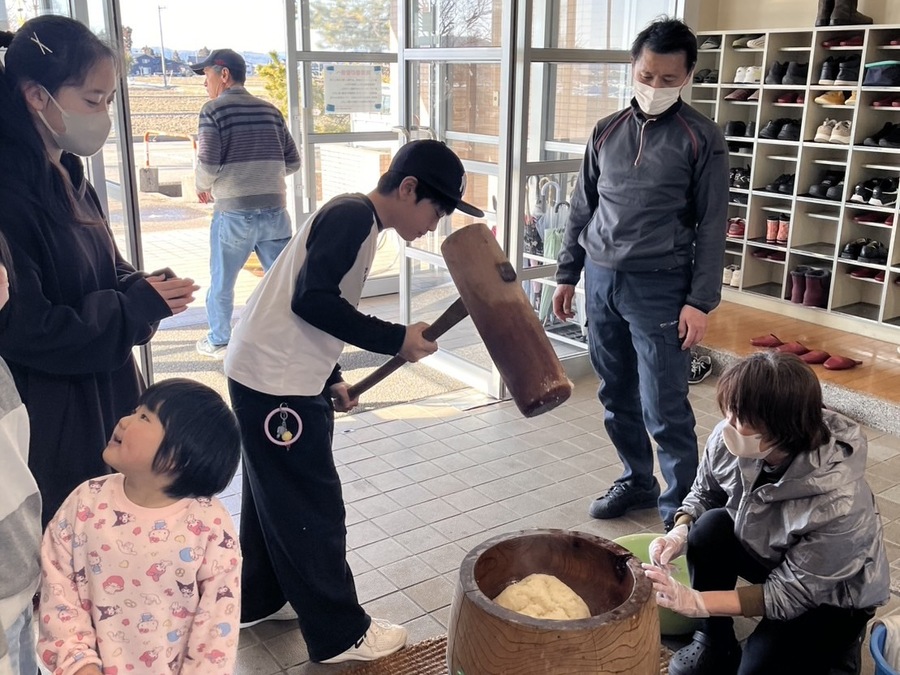 2月22日(日)三世代交流カローリング大会&餅つき (北部体育館)13:00~ 開催されました, 餅つきは本江の新田さん宅の道具を借用し、ご指導もして頂きました。